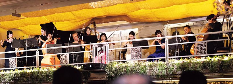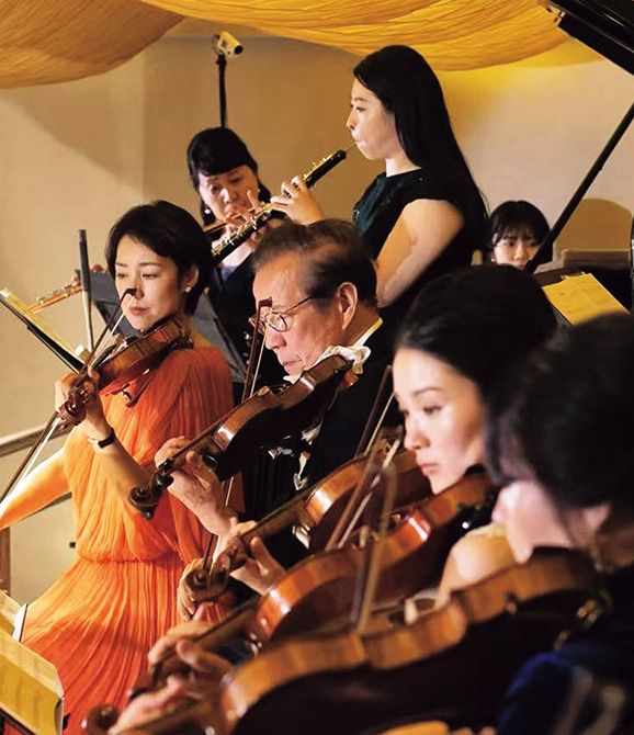 2025年7月、「中国飯店」50周年&「富麗華」25周年を祝うパーティではご一家で演奏を披露。富造さんと次女の理恵さん、長男の誠一さんの奥様・沙祈子さんはバイオリン、富造さんの奥様・麗子さんはフルート、誠一さんはチェロ、長女の正恵さんはピアノを担当した。息の合ったパフォーマンスに万雷の拍手が。(写真2点とも中条富造さん提供)
