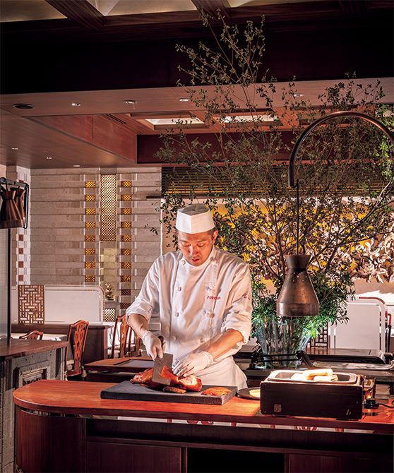 グループの旗艦店である「富麗華」の1階フロアでは、北京ダックの仕上げのデモンストレーションが。美しい手さばきで皮を薄く剝ぎ、甘味噌やきゅうりなどと一緒にクレープ状の生地で巻き上げる。
