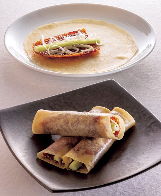 レジェンド・メニュー(1) 「北京ダック」中国本土では肉もともに供する店が多いなか、パリパリの香ばしい皮だけを薄く剝ぎ、贅沢に食べるのが「中国飯店」流。皮の厚い北京種を専用窯でゆっくり焼き、油をかけながら照りと香ばしさを出す。クレープ生地も工夫を重ね、冷めてもしっとり柔らかさを保つレシピに。具材は「分量のバランスがとても重要」と、中条さんの考える理想の形に仕立ててくれる。