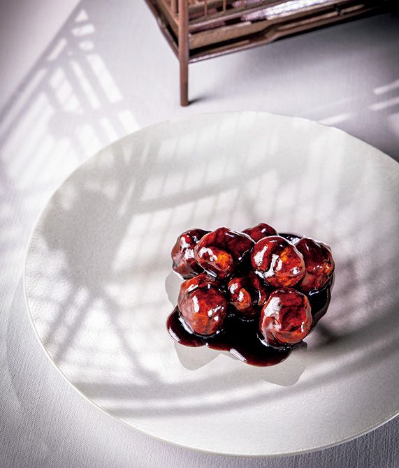 レジェンド・メニュー(2) 「上海名物黒酢の酢豚」日本でおなじみのケチャップ味の赤い酢豚は広東料理。中国飯店では野菜が入らず、豚肉のみの真っ黒な上海流酢豚。当地の伝統料理「骨付きスペアリブの黒酢煮込み」を、食べやすいように骨を除き、脂と赤身のバランスがよく肉質が柔らかい肩ロースに部位を変更して酢豚仕立てにした。香りのよい黒酢、砂糖、醬油でたれを、下味にはカレー粉も少々。高温で二度揚げした肉の表面はカリカリで、中はジューシーな、オリジナリティの高い逸品。