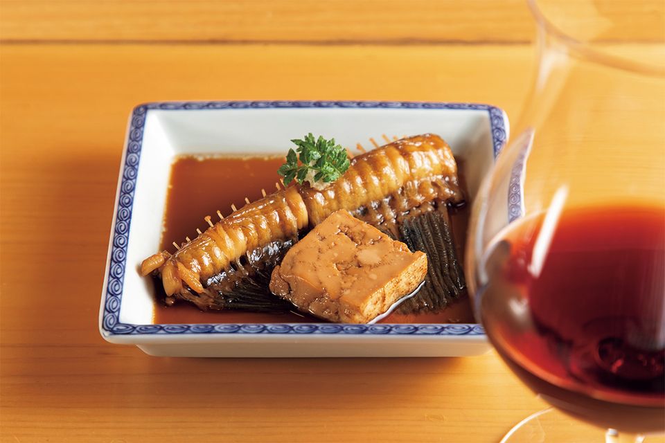 ブルゴーニュの赤(グラス4000円)と好相性。「星かれいのエンガワの煮付け」(3000円)。
