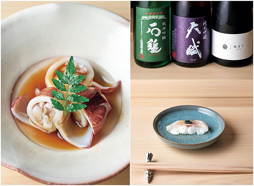 6、7品が出るコースのつまみから。右・白甘鯛をさっと酒蒸しにしたもの。左・ゆでたやりいかにきんめ鯛のあらでとっただしの餡をかけたひと皿。手をかけすぎず、シンプルな仕立てもお鮨屋さんのつまみらしい。