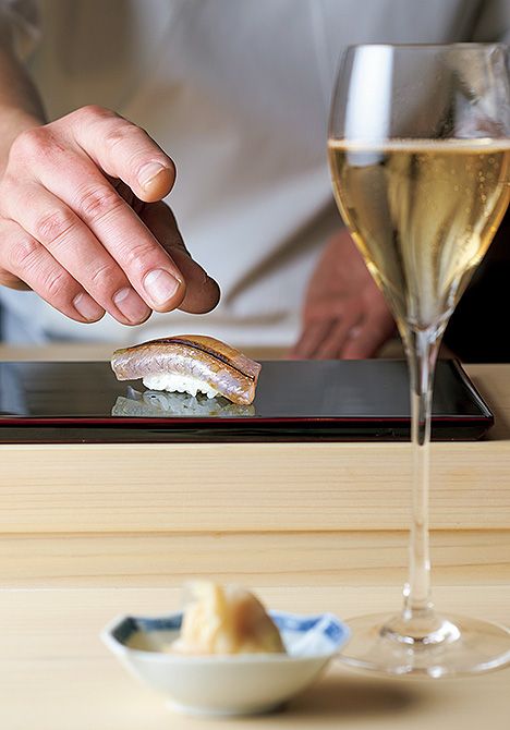 取材日、コースのにぎりはさっと塩じめにした旬のさよりから。軽やかな味わいがシャンパンとよく合う。ほか、日本酒も豊富に揃える。