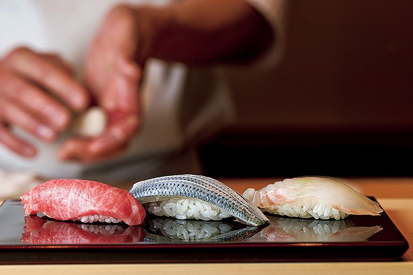左から千葉・勝浦の本まぐろの中とろ、天草のこはだ、明石のひらめ。コースのにぎりは全部で12、13かんほど。魚介は豊洲市場が中心ながらも、白甘鯛やさわら、真鯛などは愛媛の漁師・藤本純一さんから取り寄せている。修業先の「鮨 水谷」を彷彿とさせるにぎり鮨の流線型が美しい。