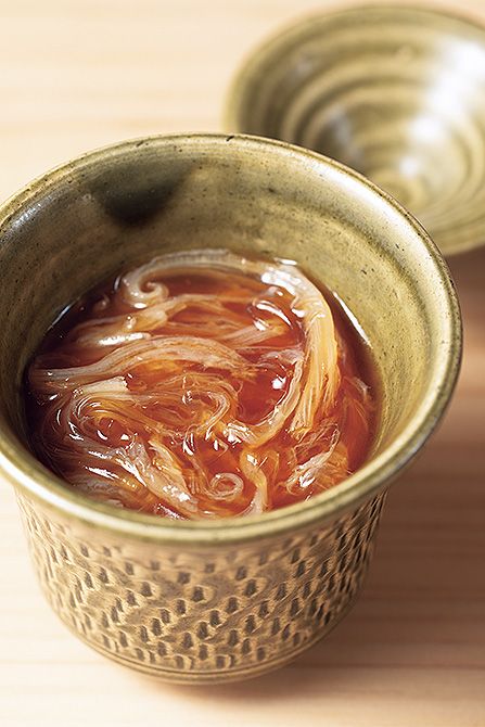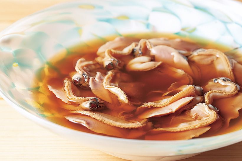 煮はまぐりは低温で柔らかく炊いてから味つけしただしにひたし、味を含ませる。