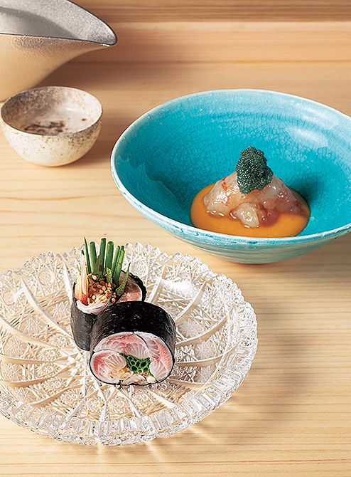 手前から、たっぷりの薬味を巻いた「いわし海苔巻」。火を入れた卵黄だれをからめていただく、ぼたん海老のづけ。上にはぼたん海老の卵がのる。
