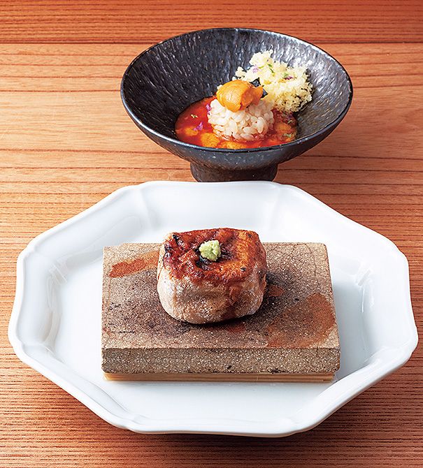 石焼きにした熱々の「焼き胡麻豆腐」、奥は天かすの食感をきかせた「うにごはん」。