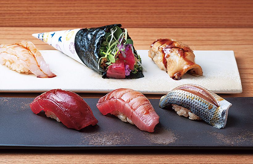 手前右から、豊洲から直送したこはだ、中とろ、づけ、奥右から、煮あなご、江戸前ハーブの手巻き、ぼたん海老。