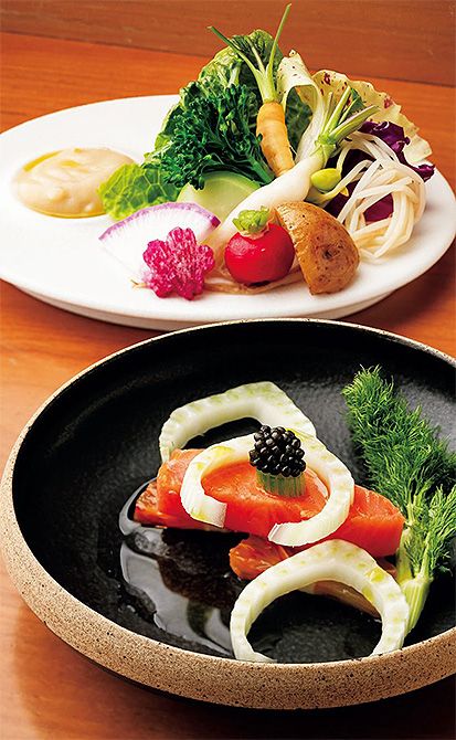 合間に出される「アル・ケッチァーノ」のスペシャリテ・旬の潮菜から「富士サーモンの43度調理とフェンネル」「山形旬菜のバーニャカウダ」。