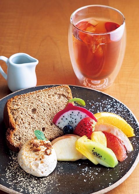 季節のフルーツを添えた「ほうじ茶香るシフォンケーキときな粉クリーム」(ドリンクとセットで)1600円。
