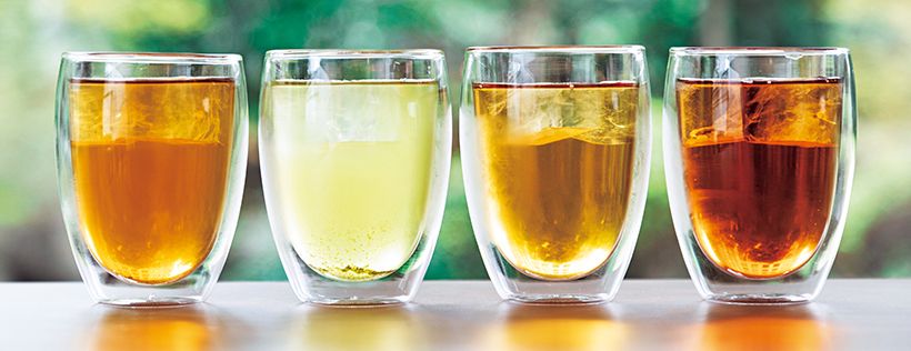 豊かな香りが広がるセレクトティーのほんの一部。左から愛媛「石鎚黒茶」800円、五島列島「レモングラス緑茶ブレンド」750 円、静岡「焙煎烏龍茶」900円と「笹場紅茶」800円。