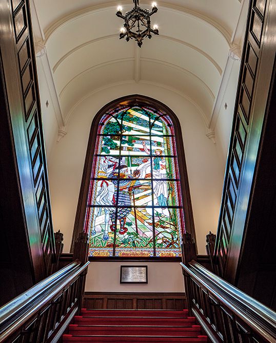 2階は「福澤諭吉記念 慶應義塾史展示館」。階段上のステンドグラスには、慶應の塾章を持つ女神と「ペンは剣よりも強し」という意味のラテン語が記されている。