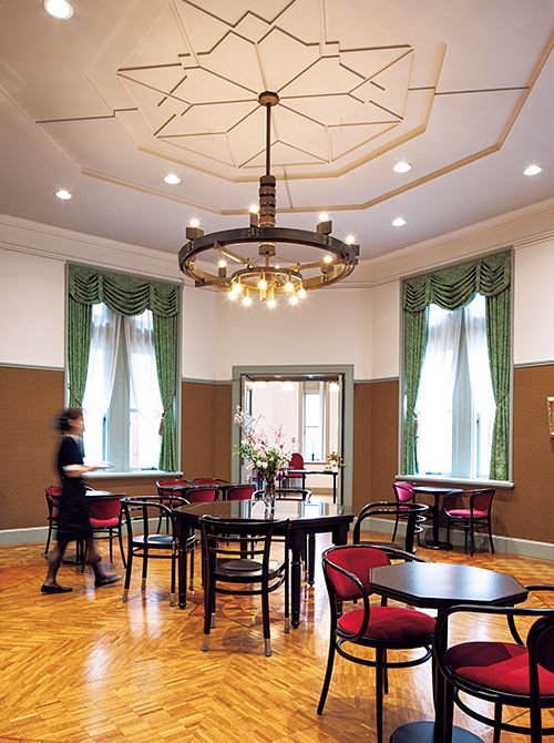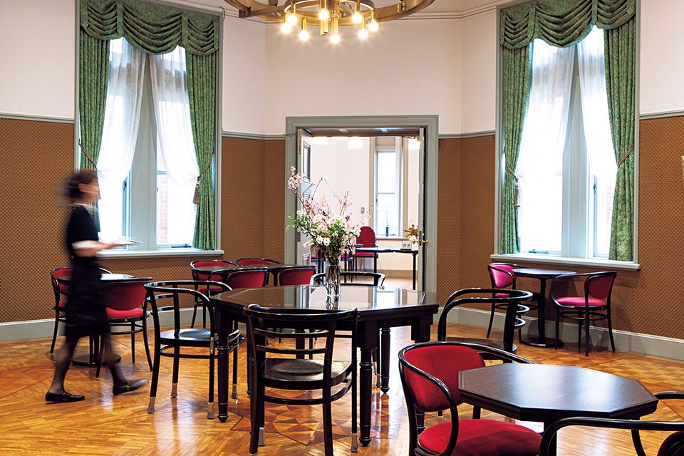 店名の由来になった八角形の建物は明治45年に建てられたもの。カフェとして開業した2021年に、寄木張りの床やシャンデリア、壁紙など往時の内装が継承され、そのレトロで上品な室内装飾と調和するように八角形のテーブルや曲げ木のチェアが配されました。
