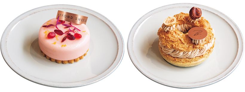 左・ライチにピンクグレープフルーツやレモンを合わせたムース。ほどよい酸味が心地よい「ライチ&シトラス」896 円。右・小麦はもちろん、乳製品・卵を使わずに、パリパリのシュー皮とリッチなクリームを合わせた「パリ・ブレスト」864 円。