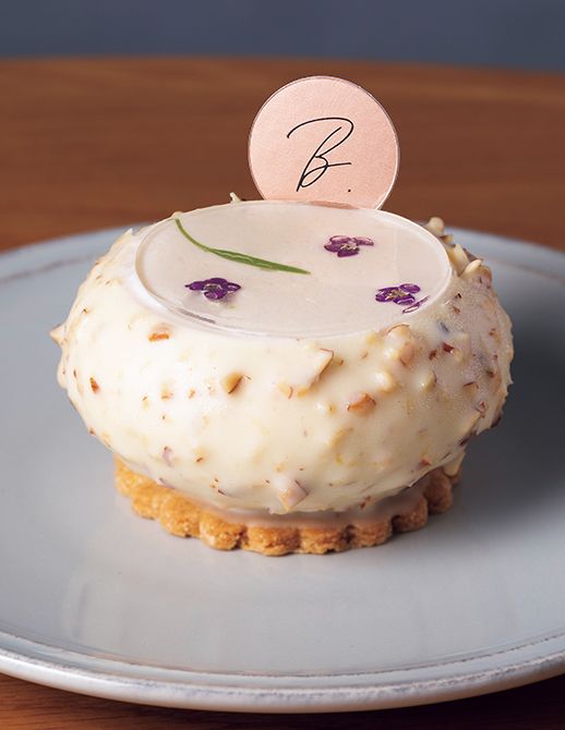 5月に登場したばかりの新作「アウラ」。レモンクリームとスイートバジルの2層の生地をバナナムースで包み、アーモンド入りホワイトチョコでコーティング。1058円。