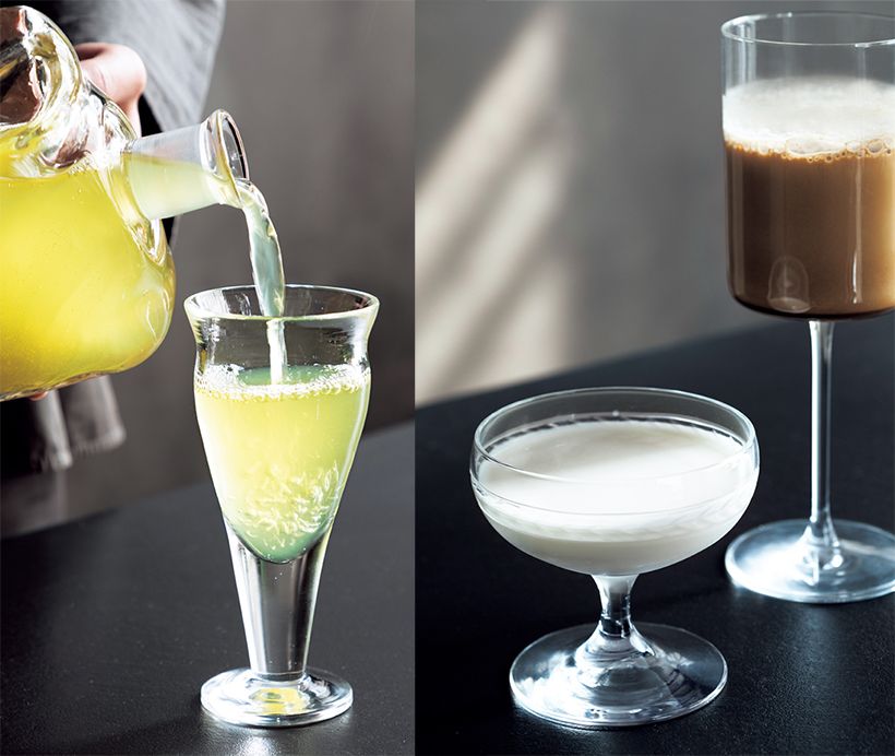 左・「水出し茶(八女鰐八)」1100円をデカンタで。右・手前はレアチーズケーキ「ピュアレア」990円、奥は「焙じ茶ラテ」1320円。ペアリング「二茶一菓」は3500円。