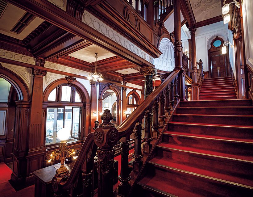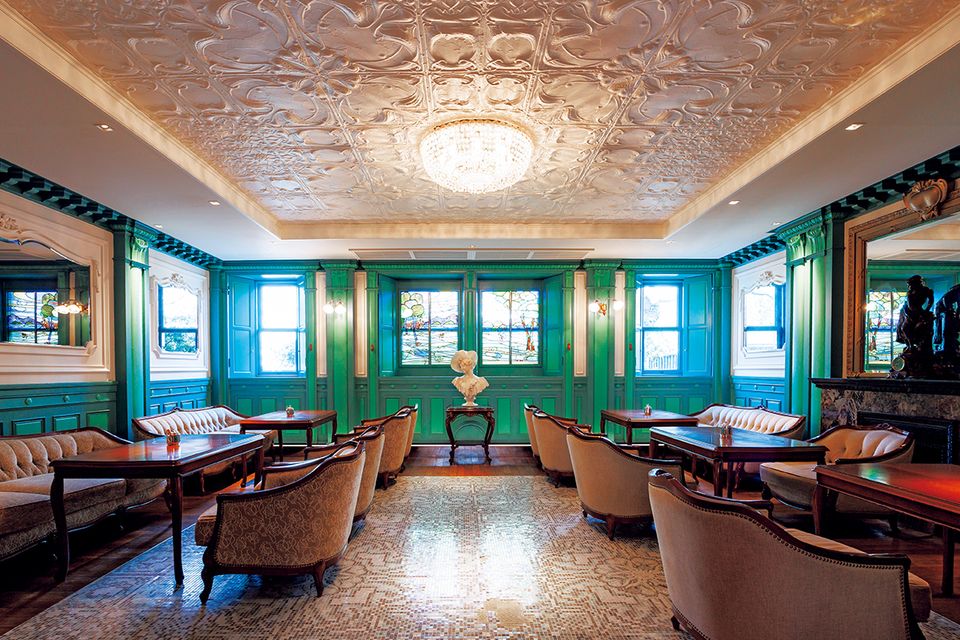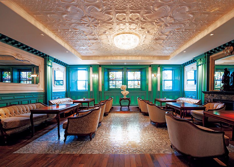 かつてご婦人方の社交の場として使われていたロココ様式の「迎賓の間」は、バカラ製のシャンデリアやアンティーク家具、漆喰彫刻など、栄華を誇った時代を彷彿とさせるしつらいが随所に施され、建築ファンにとっても見逃せない場所に。