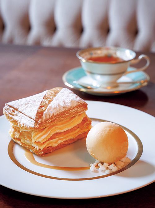 シグネチャースイーツ「ミルフォイユ」1850円。こだわりのパイ生地はスプーンで食べられるほどサクサクで軽やか。