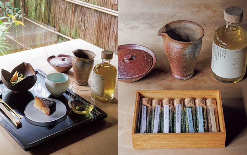 左・〈白土〉 オーガニック ティーペアリングコース(煎茶2種、茶菓2種)3900円。右・ボックスの中に茶葉が入っており、香りを確かめながら選ぶ。