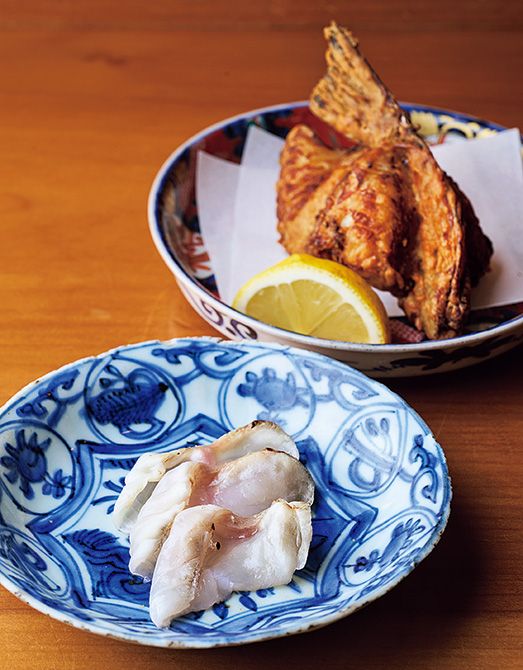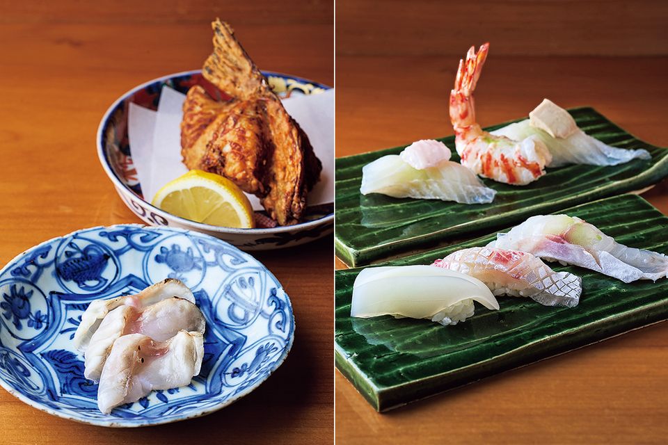 手前はとらふぐのたたき。奥は名古屋ふぐのから揚げ。お造り、煮物、揚げ物、リゾット、卵焼きなどの料理と、最後に握りが10貫。メニューはその日に届いた魚次第。「瀬戸内の魚は、日本一おいしい。時間とお金をかけて食べ比べた結果なので、自信をもってこう言えます」。