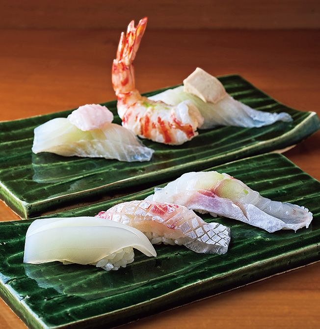 握り。前列左から、いか、鯛、白甘鯛。後列左から、えんがわがのったほしがれい、車海老、肝がのったかわはぎ。
