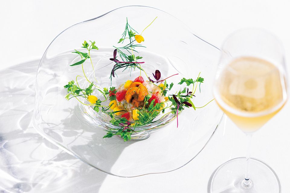 写真は盛夏の前菜より。帆立貝、毛がにやうに、マンゴーなどにういきょうのジュレを添えた一品は、ブラン・ド・ブランのシャンパーニュがよく合います。ランチ1万1000円~、ディナー2万2000円~。要予約。