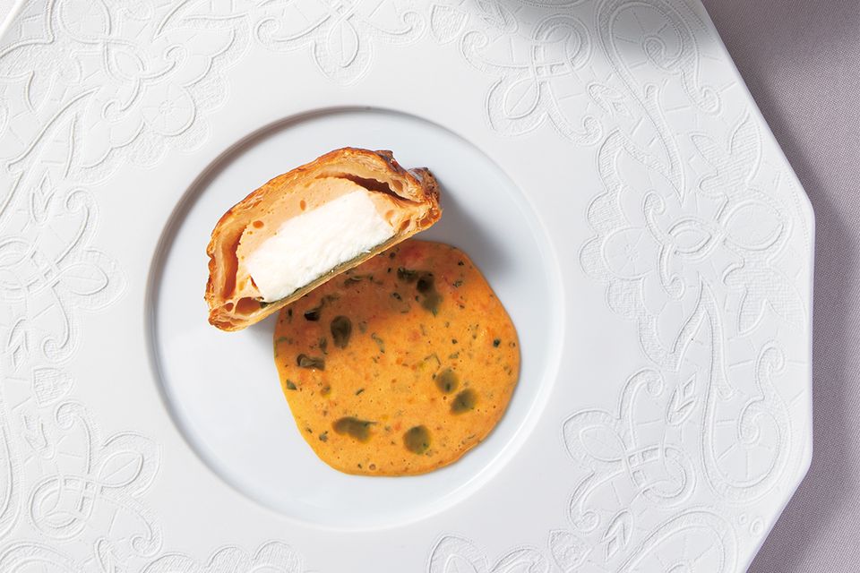 写真手前の「スズキとオマール海老のムースのパイ包み焼き」はベアルネーズソースにトマトの風味をきかせ、奥の「旬の野菜と稚鮎のフリット」は柑橘と抹茶で爽やかに仕立てた前菜。昼6600円~、夜1万3200円。要予約。
