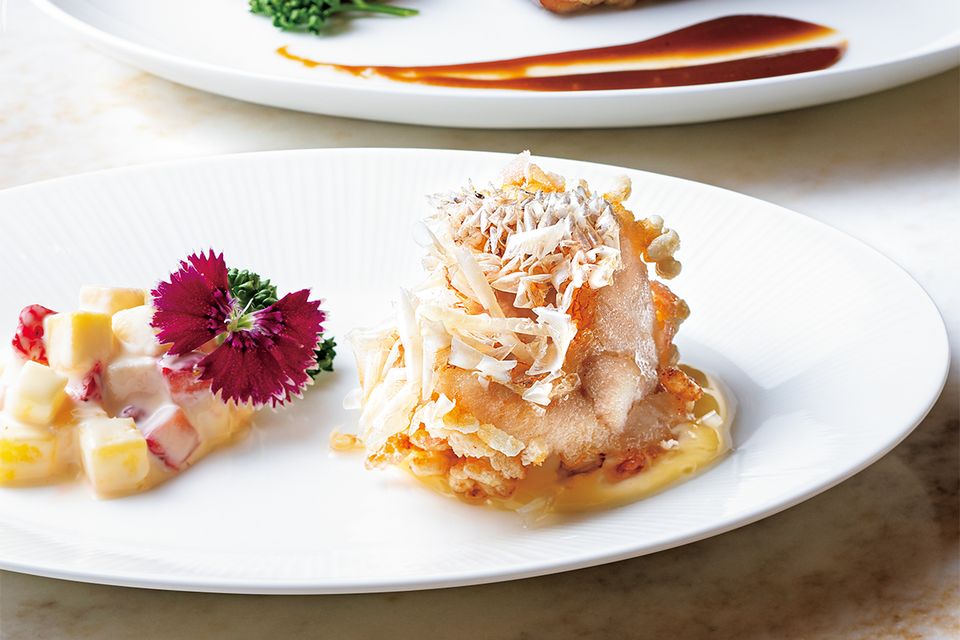 写真手前は銀座店限定「甘鯛の米衣揚げ」。奥は中華腸詰めや干しえびを混ぜた詰め物に豚の皮を纏う「イベリコ仔豚ローストのもち米詰め」。コース2万880円~、昼のみ6880円~。要予約。