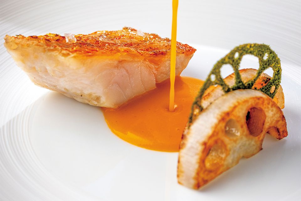 「キンキ スペックソース」は備長炭で焼き上げた後、国産の肉桂の枝でスモークして芳香をまとわせ、キンキのだしとイタリアの生ハム「スペック」のソースを添えて。