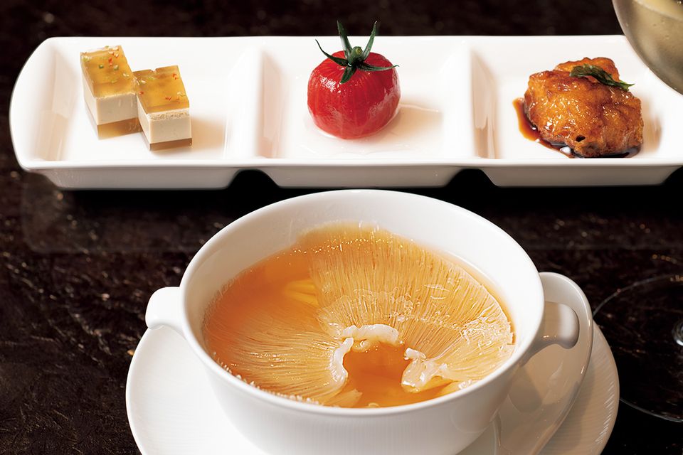 その中にいるだけで気持ちが上がりますが、スペシャリテを盛り合わせた前菜やふかひれスープをいただくうち、そのうまみに満ちた味わいにさらに盛り上がること間違いなし。大切な家族や友人ととっておきの日に訪れたい、まさに“宝石”のように輝く一軒です。