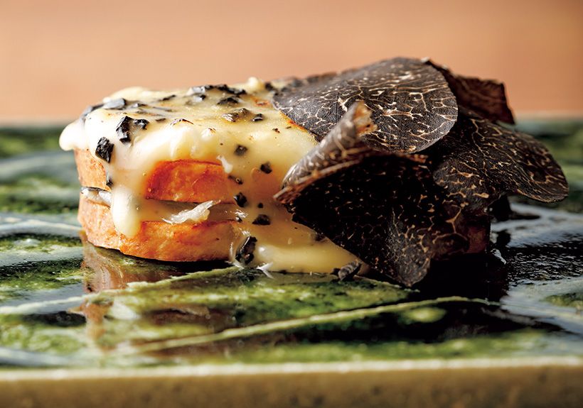 ブリオッシュに、黒トリュフを混ぜたモンドールチーズを重ねてあぶり、さらにそこにスライスした黒トリュフを飾って。
