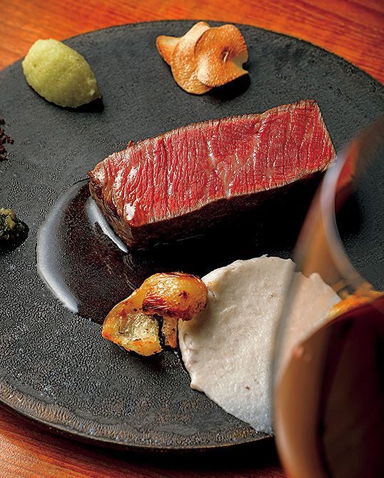 国産の黒毛和牛は牛肉のジュと、自家製の古代米酒粕の塩、チミチュリソースなどお好みの味で楽しんで。