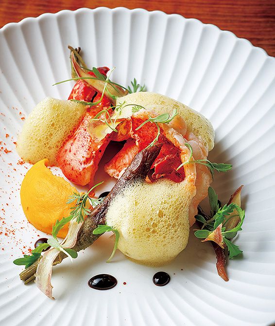 ブランデーで香りをつけたオマール海老に、金時にんじんとオレンジのソースが暖かな日差しのように寄り添う。