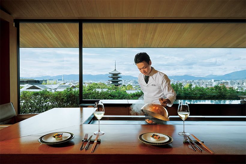 その風景は、まるで「京都」をテーマに名匠が描いた一幅の絵。八坂の塔を望む絶景とともに、フランス料理の味わいを鉄板焼きスタイルで楽しめるのが、パーク ハイアット 京都内の「八坂」。