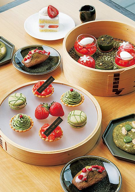 京金網を敷いた曲げわっぱに、スパイスをきかせたいちごタルトや、抹茶の風味を生かしたモンブラン、表面を苔に見立てた抹茶のテリーヌなど、眼福のスイーツが並びます。その都度焼きたてが供される名物のマドレーヌは、いちごソースをまとった抹茶仕立てで登場。さまざまな趣向で宇治抹茶といちごを味わい尽くせます。