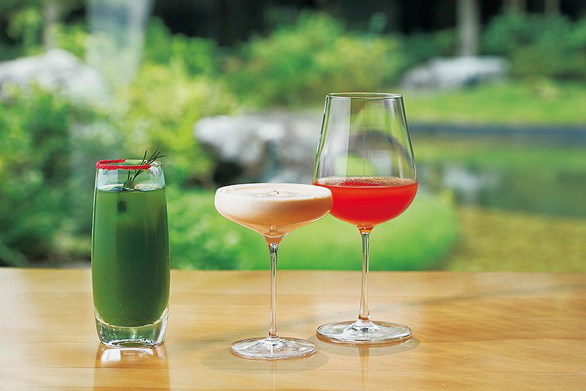 「抹茶と梨のモクテル」(左)など3種のオリジナルモクテルがついたフリーフロー。20種以上の紅茶も揃う。