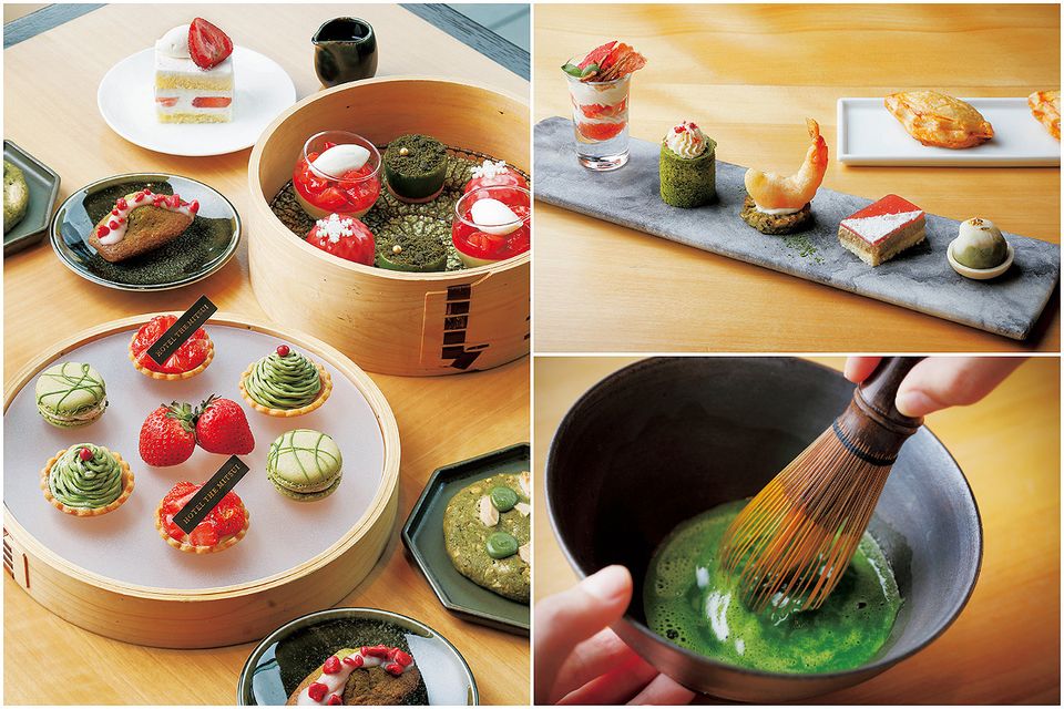 「宇治抹茶&京都産いちご アフタヌーンティー」は、周年の節目に誕生したホテル特製の宇治抹茶「縁紫(えにし)ENISHI」を、ゲスト自身の手で点てることからスタート。