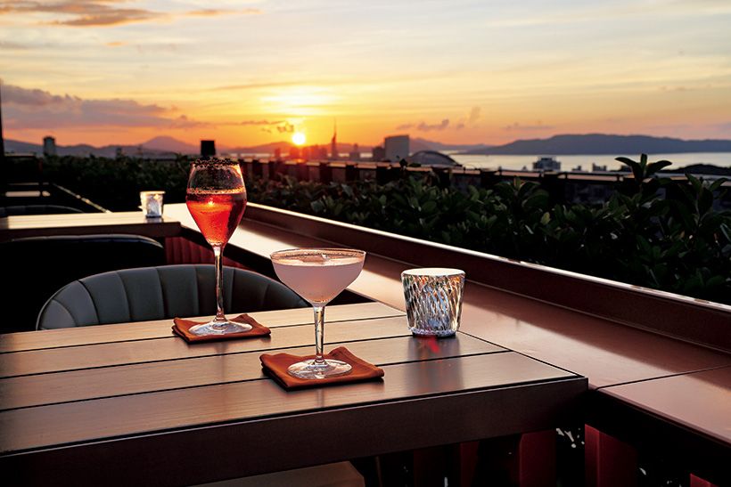 食前に24階から博多湾を見渡せる絶景バー「ベイ」でサンセットカクテルを楽しんでから、ダイニングに向かうのも粋。