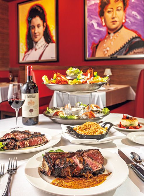 手前から・「コナコーヒークラステッドの骨付きNYストリップ・エシャロットバター添え」81ドル、「ポルチーニラブド骨付きリブアイバルサミコ添え」95ドル、「ロブスターマカロニチーズ」29ドル、「冷製シェルフィッシュプラッター大」169ドル、「ブリュレスタイルチーズケーキ」16ドル。