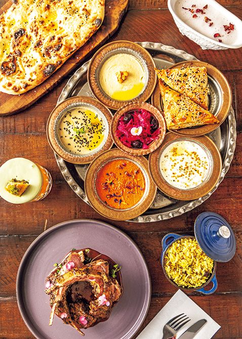 「メゼプラッター(フムスやトリュフハニーラブネなどの盛り合わせ)」43ドル〈中〉。「バクラバマイタイ」20ドル〈中左下〉。「ドライエイジド テンダーロインラム」56ドル〈手前〉。