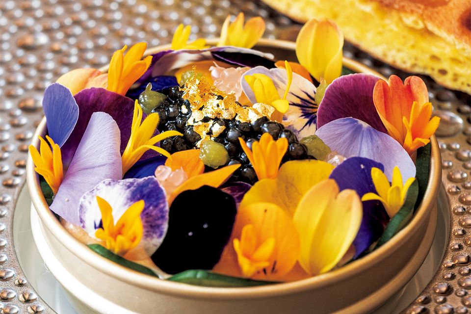 写真はシグネチャーの一つ「オシェトラキャビアと季節野菜のエスプーマ」。全11皿のコースは2万7500円。
