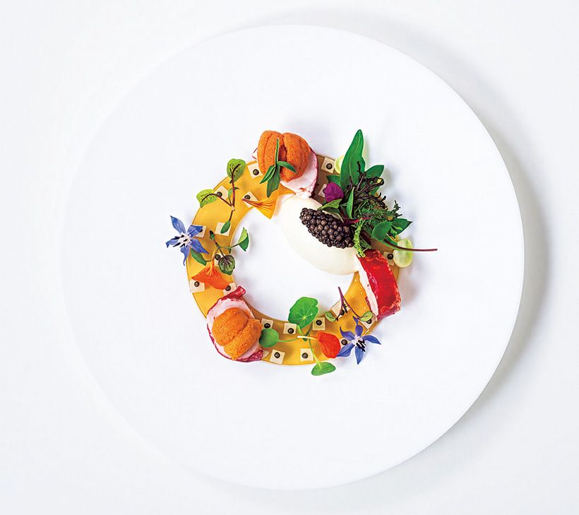 「エピュレ オマールのジュレカリフラワーのムースリーヌ キャビアとウニ」は、海の幸に、自然への憧憬を感じさせる野草を添えた前菜。「一口の中に、うまみの層と自然の息遣いを感じていただけたら」と厚東シェフ。