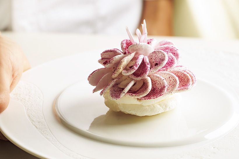 バニラアイスとクリームの上にメレンゲの花びらをあしらったデザート「ヴァシュラン」。