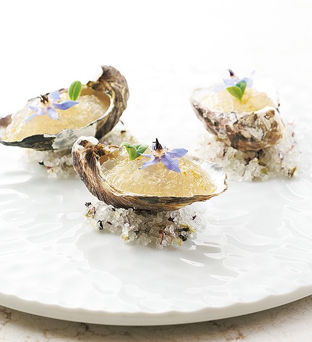 「ふっくらと蒸した牡蠣、ビネガーをきかせた海水ジュレ クレソンのクリームソース」。ボリーさん時代の「ロオジエ」の人気スペシャリテをこちらでも。