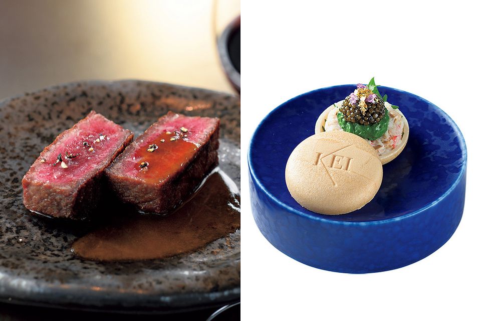 和牛は鮮度のよいフィレか、100日以上専門家が熟成したサーロインを選べる。土佐備長炭で香り高く焼き上げ、「Restaurant KEI」と同レシピのジュ・ド・ボー、もしくはおろしポン酢やわさびなどの薬味4 種セットを好みで選べる。