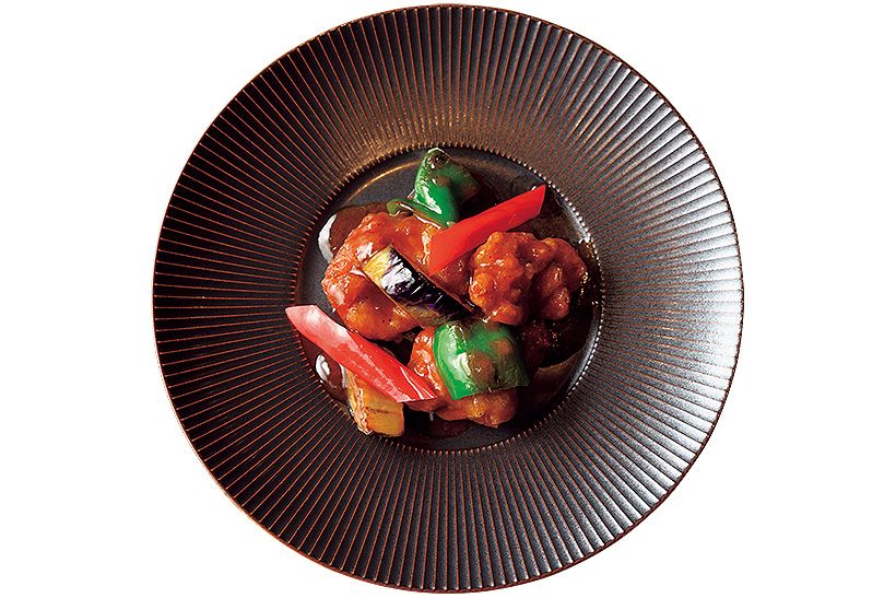 柔らかい伊逹鶏をベニエ生地でカリッと仕上げ、酢豚のソースをからめた 一皿。