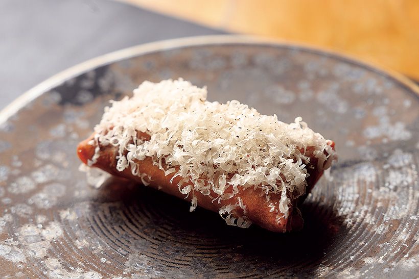 12時間煮込んだ牛テールとほうれん草の春巻きにパルミジャーノをのせて。