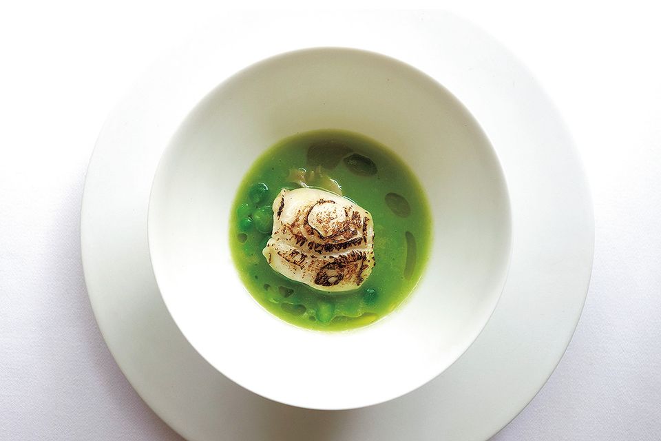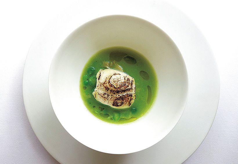無農薬野菜と海の幸の融合。「明石鯛の白子の炭火焼 うすいえんどう豆のスープ仕立て」。