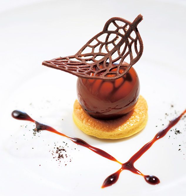 池内料理長のスペシャリテ「フォワグラの小さなボール仕立て コーヒー風味FOURGRAINS 風」。中村統括名誉総料理長と岩崎総料理長の各々のスペシャリテの味わい、盛りつけなどを融合させて仕上げた一品。