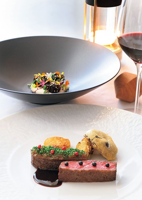 能登半島復興への祈りも込めた「昆布とバルサミコ酢をまとった輪島ふぐ」(奥)、「特選常陸牛 カンポットペッパー風味」(手前)。
